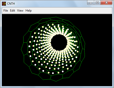 Задав параметры, можно сконструировать готовую модель нанотрубки, вызвав команду Create CNT. CNTH позволяет при необходимости отключать отображение межатомных C—C-связей, оставляя лишь отображение ядер атомов углерода в виде точек. Данная возможность доступна при использовании команды Display bonds из меню View.