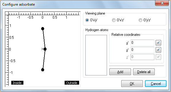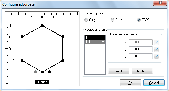 Рис. 4. Диалоговое окно Configure adsorbate Когда положения атомов водорода будут правильно отображаться на всех трех проекциях, нажмите кнопку OK.