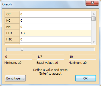 В «NanoEvolver» используются аппроксимирующие парные потенциалы в форме функции Морзе. Параметры потенциалов — D0 (энергия диссоциации), R0 (равновесное расстояние) и ω (частота колебаний) — чаще всего рассчитываются неэмпирическими методами ab initio, а подходящая аналитическая форма электронным термам придается с использованием метода аппроксимации по дискретным расчетным точкам. В данном случае расчеты параметров всех используемых потенциалов связей в системе выполнены методом нелокального функционала плотности в пакете программ «Winbond».
