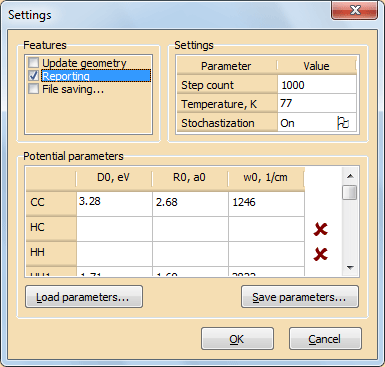 Рис. 9. Диалоговое окно выставления опций и параметров Установите параметры, как показано на рис. 9. Параметры межатомных потенциалов введите нажав на кнопку Load parameters…, загрузите эти данные из внешнего файла параметров Potential_parameters.txt, который расположен в той же папке, что и загруженная структура.