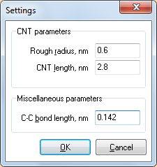 Для указания этих параметров вызовите команду Settings… из меню Edit. В появившемся окне нужно ввести значение радиуса, длину нанотрубки и при необходимости — межатомное расстояние C—C.