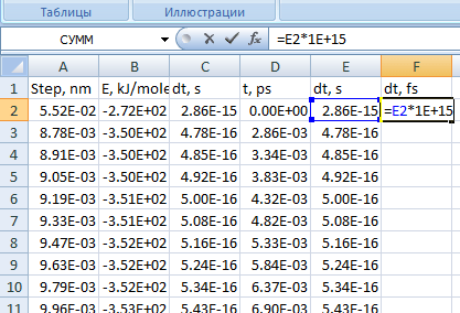 Рис. 15. Окно программы Excel с формулой для пересчета размерности кванта времени Постройте развертки эволюции исследуемой системы в координатах