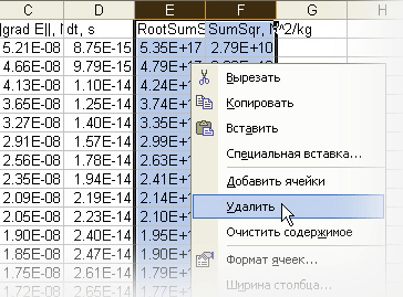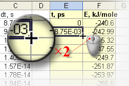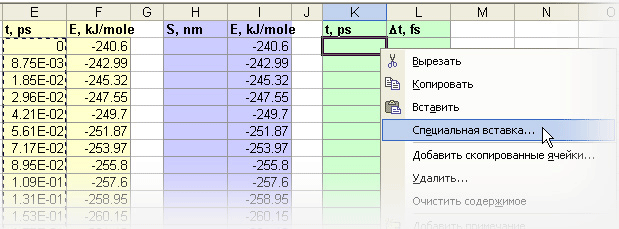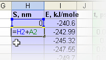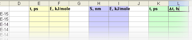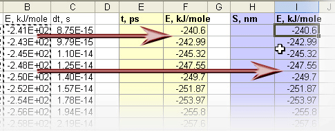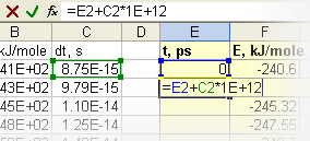Рис. iii. Перенос данных полной энергии связи Для расчета прошедшего к моменту каждой итерации общего времени эволюции (столбцы E и K) следуйте такой схеме. Поскольку отсчет времени ведется от начала эволюции, то очевидно, что начальное значение t равно нулю. Введите 0 в ячейку E2. В соответствии с примечанием 3 выше введите в ячейку E3 следующую формулу: