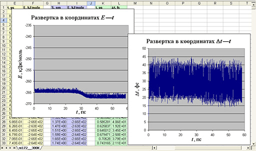 Рис. 4. Окончательный вид рабочего листа Excel. Случай криогенных температур Проанализируйте вид полученных разверток. Сделайте выводы относительно общего характера поведения полной энергии связи E и кванта времени Δt на протяжении эволюционного процесса, а также относительно более тонких деталей и подробностей хода разверток. Отметьте суммарную длительность процесса достижения стационарного неравновесного аттрактора. Эта величина важна в частности в том отношении, что существуют экспериментальные спектроскопические методы регистрации времени полной трансформации наночастиц.