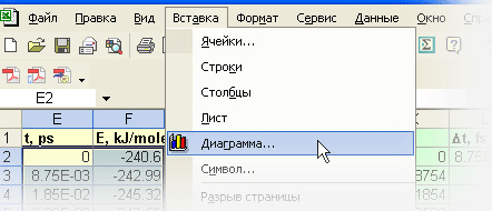 Выделите полностью все численные данные в столбцах E и F и вызовите окно «Мастера диаграмм» (меню Вставка, команда Диаграмма…).