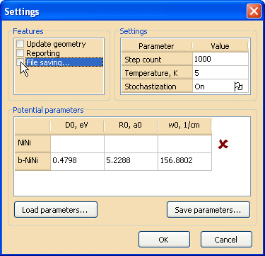 Рис. 1. Диалоговое окно выставления опций и параметров потенциалов Установите параметры в группе Settings, как показано на рис. 1. Не закрывайте пока окно Settings. Установите флажок File saving… в группе Features. При попытке установки флажка вам будет предложено указать путь и имя log-файла, в который будут заноситься данные расчета на каждой итерации вычислительной процедуры. Задайте понятное имя файла (например, Ni172_5K.log) и нажмите кнопку Сохранить.