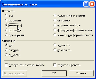 Рис. vi. Вызов окна Специальная вставка В окне Специальная вставка установите переключатель в положение Значения и нажмите кнопку OK.