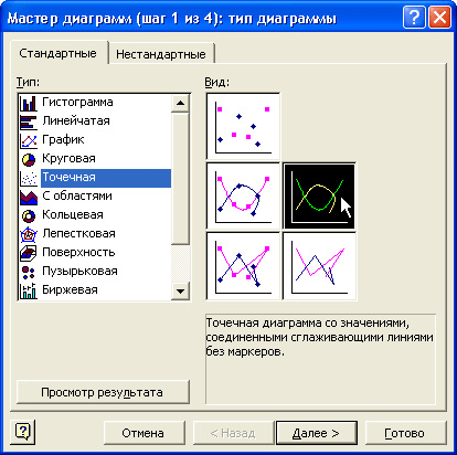 Рис. x. Команда вставки диаграммы На первом шаге Мастера выберите тип диаграммы «Точечная» и вид сглаженной линии без маркеров.