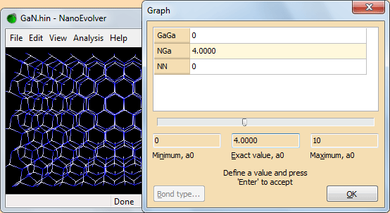 Вызовите окно Graph одноименной командой меню View. Для пары GaN задайте радиус обрезки, равный 4 a0. Не забывайте нажать Enter в поле ввода Exact value после задания радиуса обрезки.