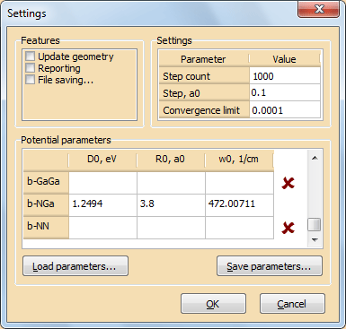- Параметры потенциалов загрузите из файла GaN.txt, нажав кнопку Load parameters…