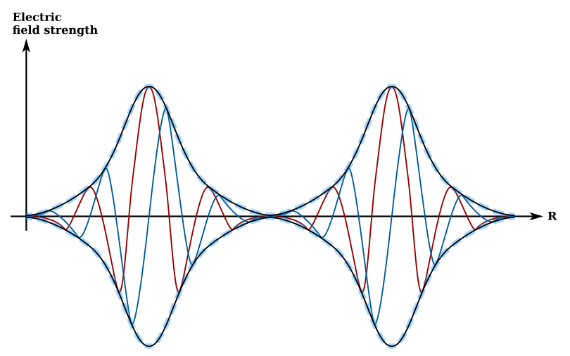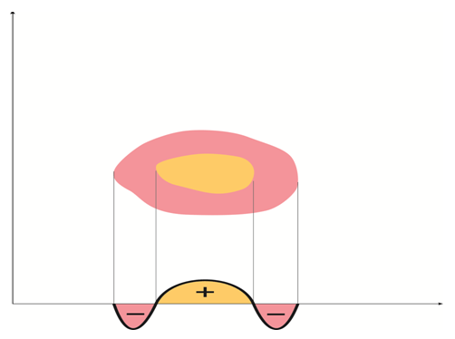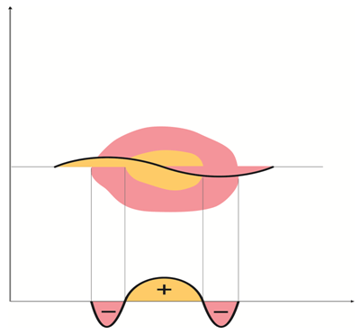 Таким образом, сжатый импульс жёсткого ультрафиолета или мягкого рентгена генерирует электрон-дырочное пакетно-компактное возбуждение «дырка зоны остова – электрон зоны проводимости». Время радиационного затухания возбуждения в основном определяется малостью интеграла перекрывания волновых функций дырочной и электронной компоненты. Оно может достигать микросекунд, так как проекция остовных волновых функций на волновые функции состояний зоны проводимости ничтожно мало. Когерентные электронные и дырочные квантовые состояния формируют в пространстве материала компактную кинематическую волну зарядового и спинового сопряжения — электрон-дырочный «плазмоид» с распределением плотности избыточного положительного заряда «дырки» внутри объёма, а отрицательного избыточного заряда «электрона» на границе его пространственного носителя (Рис.4). Протяжённость носителя электрон-дырочного плазмоида в материале не превышает 10 нм (генерирующий импульс УФ с энергией порядка 10 эВ) и не меньше размера атома 0.3 нм (генерирующий импульс МР с энергией порядка 300 эВ).