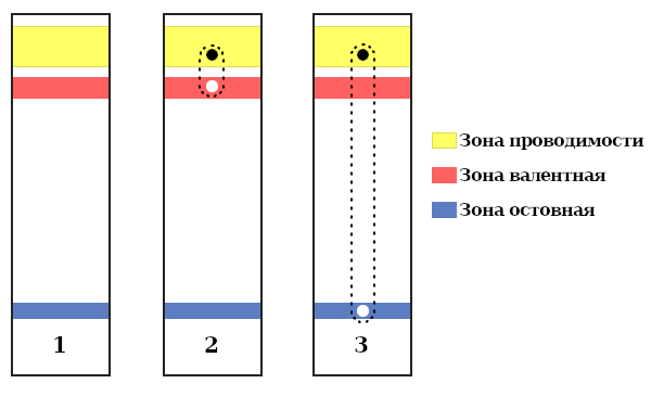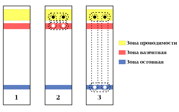 Рассмотрим детали электронных механизмов представленных на Рис.2 стадии импульсной электрон-дырочной генерации плазмоидных наночастиц. На стадии 2 при поглощении, в отличие от показанных на Рис.3(2) экситонов Френкеля в молекулах или экситонов Ваннье-Мотта в полупроводниках, связанных с переходом электрона при возбуждении из валентной зоны в зону проводимости с энергией порядка нескольких электрон-Вольт, генерируется высокоэнергетическое пакетное электрон-дырочное возбуждение, показанное на Рис.3(3). В нём дырочная волновая функция задаётся волновым пакетом в зонах глубоких остовных электронных состояний материала. Соответственно, электронная волновая функция задаётся волновым пакетом в зонах проводимости. Неопределённость в энергии электрон-дырочных пар, как и в электромагнитном импульсе, достигает десятки электрон-Вольт.