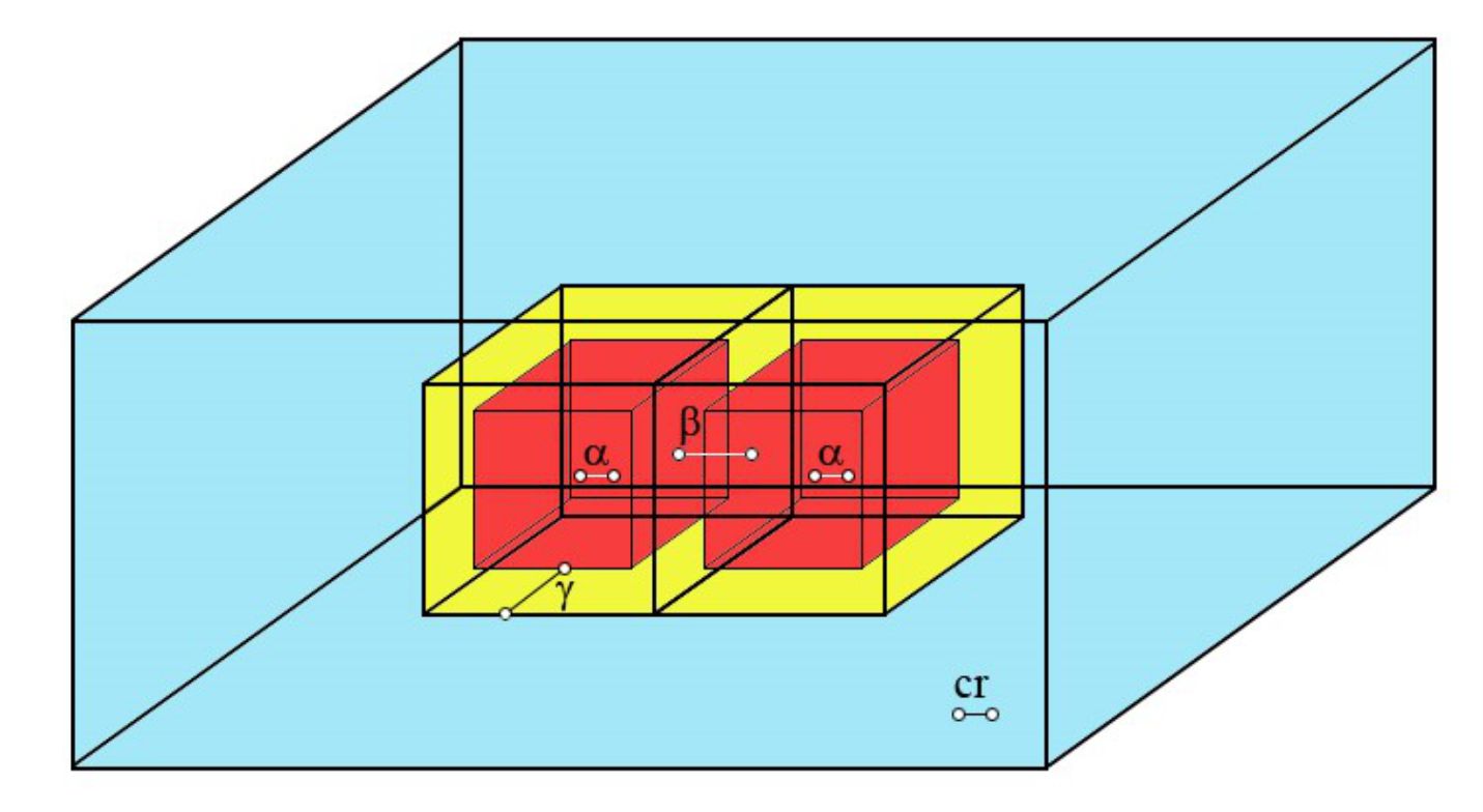 Отклик материала на запутанные аттосекундные 2γ-импульсы жесткого ультрафиолета или мягкого рентгена состоит в генерации на супраатомном уровне квантовых наноэлектромеханических систем (НЭМС) интерфейсов, образованных субатомными запутанными парами экситонов. Энергия возбуждения спутанных двухэлектронных квазичастиц и их дырок ((e−e+)~2γ~(e−e+))* накапливается в наноэлектромеханической системе 2D-интерфейсов, Толщина границы 2D-интерфейса имеет субатомный размер Rеe запутанности пар экситонов на границе капсулы НЭМС. Находясь в состоянии квантовых суперконденсаторов с разделенными зарядами спутанных пар экситонов, НЭМС интерфейсы ограничивают НЭМС капсулы, поглощающие и диссипирующие энергию 2γ-импульсов. Аттосекундная импульсная генерация НЭМС капсул аккумуляторов происходит на следующем после субатмного супраатомном масштабном нанометровом уровне материала. Запутанная пара таких капсул кубической формы показана на рисунке 12.