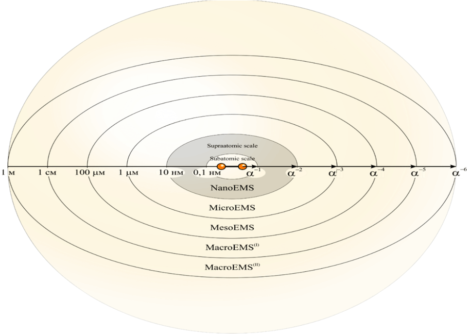 НЭМС капсулы и интерфейсы формируют матрицу интеллектуальной инфраструктуры аттосекундных актуаторов и сенсоров для выше лежащих по масштабу иерархии микро-, мезо- и макро-уровней квантовых интеллектуальных материалов. Базовый субатомный уровень запутанных электронов и их дырок ((e−e+)~2γ~(e−e+))*, супраатомный уровень наноэлектромеханических 2D-интерфейсов капсул и последующие верхние масштабные уровни неравновесных физических сред интеллектуальных материалов представлены на рисунке 13. Иерархическое масштабирование уровней интеллектуальных материалов задаётся степенями постоянной тонкой структуры физического вакуума