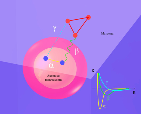 Характерная кинематическая волна зарядовой плотности электрон-дырочного плазмоида экранирует локализованную на его носителе ядерно-электронную подсистему от остальной матрицы материала, формируя вместе с ней автономную энергонасыщенную плазмоидную наночастицу малого размера (смотрите Рис.5). Такая активная наночастица характеризуется модифицированными межатомными потенциалами внутри объёма (α-потенциалы) и в трансграничной области с матрицей материала (обменные β и необменные γ-потенциалы). Расчет методом нелокального функционала плотности показал, что трансграничные потенциалы существенно ослаблены по сравнению с потенциалами в матрице материала. В результате, можно пренебречь колебательно-вращательными степенями свободы в диссипации энергии возбужденной наночастицы в матрицу материала, находящуюся в термодинамическом равновесии при заданной температуре и давлении.