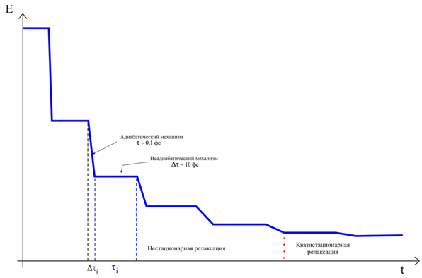 В течение диссипации энергии возбужденной наночастицы возникает цепочечный процесс релаксации (Рис.6), в котором происходит чередование двух элементарных стадий: неадиабатической и адиабатической (Рис.7). Неадиабатическая стадия — это процесс когерентного внутреннего обмена (конверсии) энергии возбуждения между двумя внутренними компонентами релаксирующей наночастицы: электронно-ядерной подсистемой и её электрон-дырочным плазмоидом. На этой стадии идёт квантово-запутанное когерентное трансформирование состояний ядерно-электронной и электрон-дырочной подсистем. Адиабатическая стадия — это процесс некогерентного обмена энергией возбуждений каждой из двух компонент наночастицы с окружающей матрицей материала.