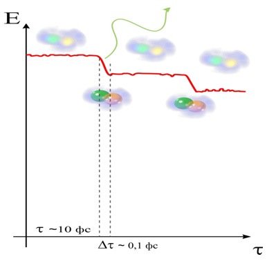 Одним из краеугольных камней рассмотренной физической модели является высокоэнергетическая когерентная электрон-дырочная пара. Она формирует в пространстве кинематическую волну зарядовой поляризации плотности электронов — электрон-дырочный плазмоид и разрушает в «нано»-масштабе атомно-молекулярную структуру материала, формируя компактную ядерно-электронную структуру плазмоидной наночастицы. Ядра и электроны этой компактной наночастицы конденсированного состояния имеют сильную корреляцию движения [15–17]. Неадиабатический процесс когерентной квантовой релаксации с краткими адиабатическими сбоями когерентности — это специфическая ступенчатая кинетика активных наночастиц наделяет их биомиметическими свойствами. Разработка методов описания такой кинетики с помощью компьютерного моделирования изложена в [1].