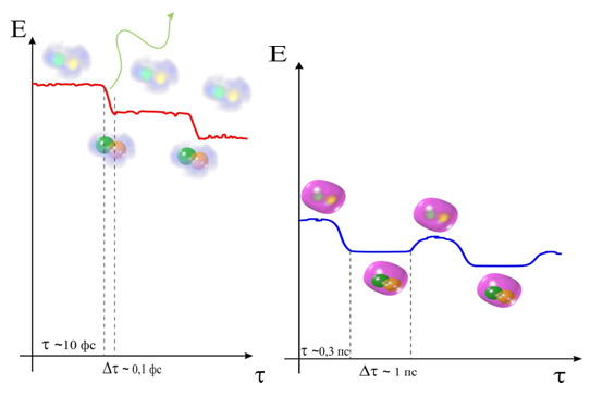 Эволюция плазмоидной наночастицы — это цепь фемтосекундных стадий квантового когерентного неадиабатического движения наночастицы с краткими аттосекундными адиабатическими сбоями когерентности. Как показано на Рис.9, двухстадийные механизмы релаксации имеют место и в биосистемных ферментативно-каталитических процессах. Эта формальная аналогия ступенчатых эволюций позволяет ввести концептуальное понятие «биомиметической» эволюции плазмоидной наночастицы.