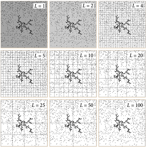 На рисунке приведён пример вычисления фрактальной размерности системы атомов в области 100×100 клеток.