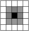 Каждая из диффундирующих частиц на последующем временном шаге занимает своё положение в одной из восьми соседних клеток в зависимости от того, какому интервалу принадлежит вероятность, генерируемая оператором случайных чисел: