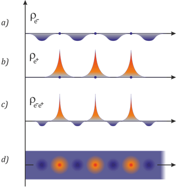 Генерация (e−e+)-плазмоида формирует в пространстве материала солитонную кинематическую волну зарядовой поляризации плотности электронов нанобота (Рис. 2c). При этом солитон плазмоида имеет характерное распределение плотности избыточного положительного заряда e+- дырочной компоненты в окрестности ядер внутри объёма (Рис. 2b) и отрицательного избыточного заряда e−-электронной компоненты в межъядерных областях плазмоида (Рис. 2a). Кинематическая волна зарядовой поляризации плотности (e−e+)-плазмоида экранирует локализованную на её носителе наночастицу от остальной матрицы материала (Рис. 2d), формируя вместе с ней автономную энергонасыщенную наноэлектромеханическую систему плазмоидного нанобота.