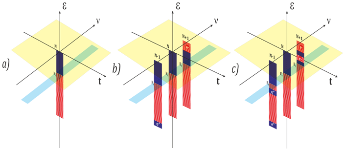 На Рис. 1 показано как открытая плазмоидная наночастица создается оператором LT(Δt) унитарно-неэквивалентным преобразованием одного листа гильбертова пространства HN закрытой N-электронной наночастицы (Рис.1а) в триплет сопряжённых гильбертовых подпространств {HN−1; HN; HN+1} пространства Фока (Рис.1b) открытого нанобота с переменным числом электронов {N−1, N, N+1}. Для описания нанобота, как системы «ядра + электроны + плазмоид (e−e+)», требуется использовать три смежных листа Фоковского пространства N−1, N, N+1-электронных состояний. Зарядово-сопряжённые квантовые состояния |N−1〉 «катиона» нанобота (с e+-дыркой плазмоида) и квантовые состояния |N+1〉 «аниона» нанобота (с e−-электроном плазмоида) спутаны плазмоидной электронной парой конденсированного состояния согласно формуле:
